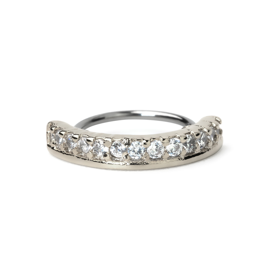 Ringens side som er i kontakt med huden din er laget kirurgisk stål, og dekoren er laget av messing. For å sette den på plass, vrir du den frem eller tilbake, slik at den danner en S. Når du har ført den gjennom piercingen vil den automatisk lukkes.