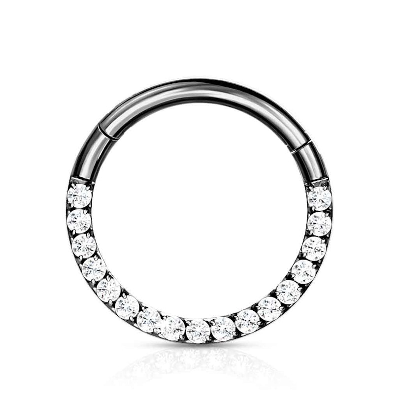 Hengslet ring i titan med stenrekke.