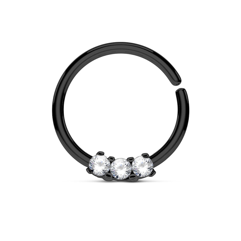 Smykker til septum er ofte store og prangende, med mindre man bruker en vanlig kulering eller segmentring. Så snart det er sten innblandet blir de store og voluminøse. Det er dog ikke tilfellet med denne septumpiercingen, som med sitt lille spinkle design allikevel har fått tre små stener plantet midt på den lille ringen.