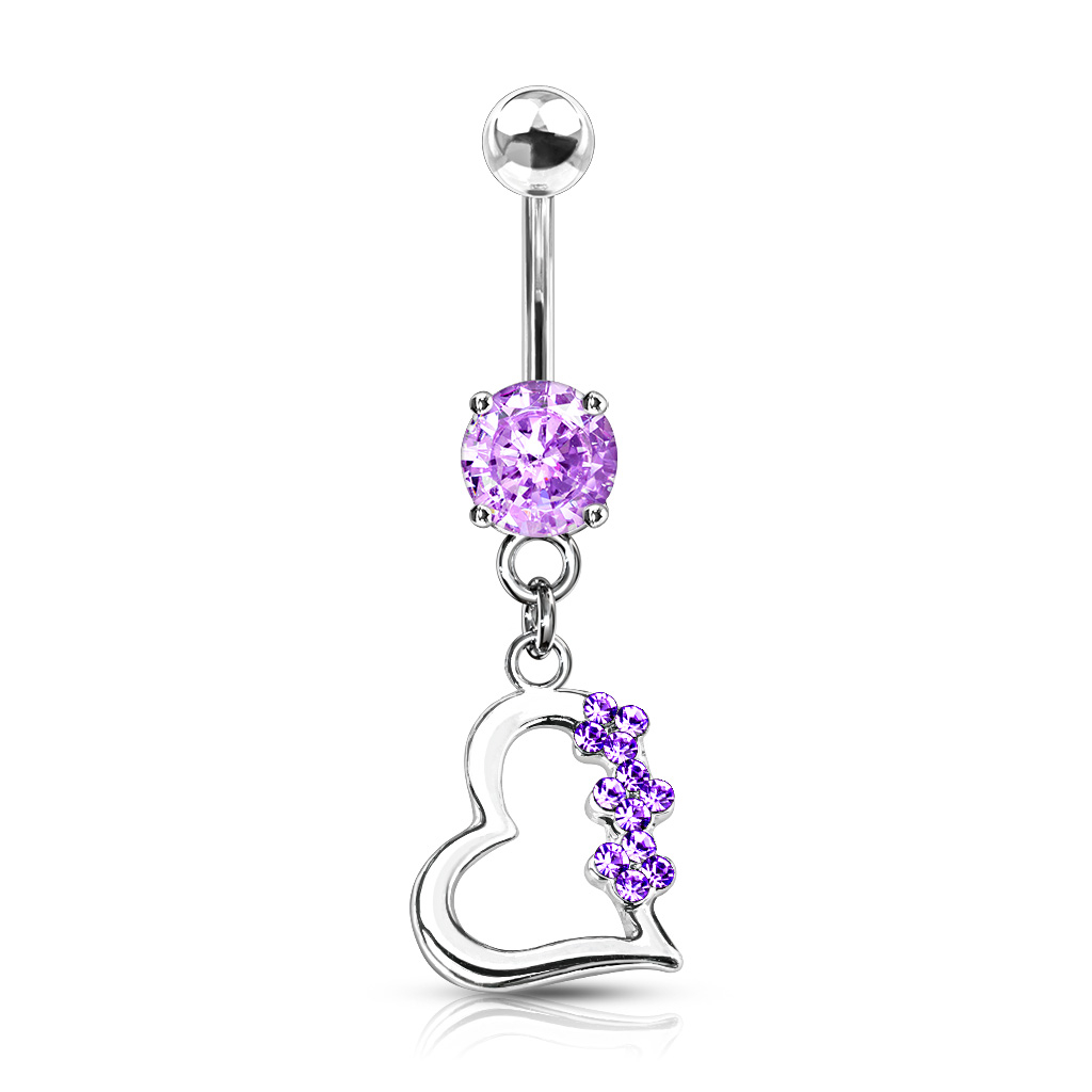 Flott utført navlepiercing som er designet i et flott uttrykksfult design med en glimtende sten og et flott hjerte med små fargede stener som anheng. Smykket fås i tre forskjellige farger, du velger bare din foretrukne farge før du går videre til bestlling.
