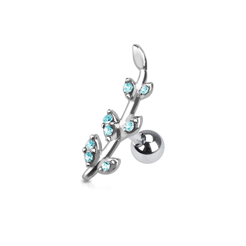 Smykket har en trådtykkelse på 1,2 mm. og er designet som en liten gren som buer svakt til den ene siden. Grenen er så dekorert med søte små blader av sten på begge sider, som kommer i tre forskjellige farger. Du velger naturligvis selv om du ønsker modellen med de klare, turkise eller rosa stenbladene.