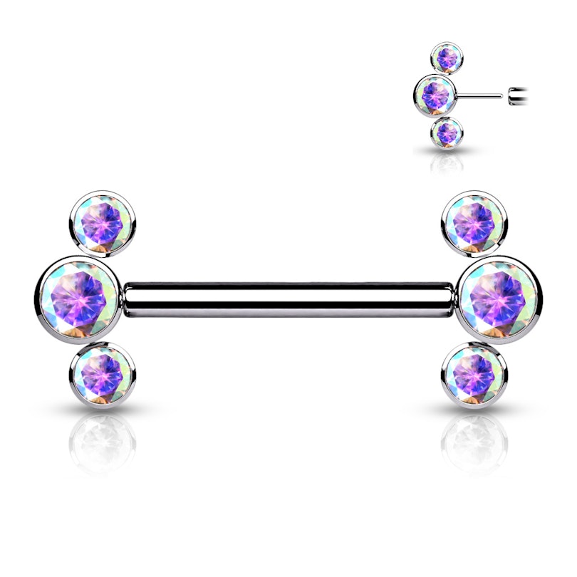 Smykket er laget av titan, som er et av det beste materialet du kan bruke til brystene dine. Stenene som sitter i hver ende er kubiske zirkoniumstener, som er festet i metallet.Den største stenen har et mål p 3.9 mm og de som er mindre har et mål på 2.9mm. Det finnes også et variert utvalg av farger på stenene å velge mellom.